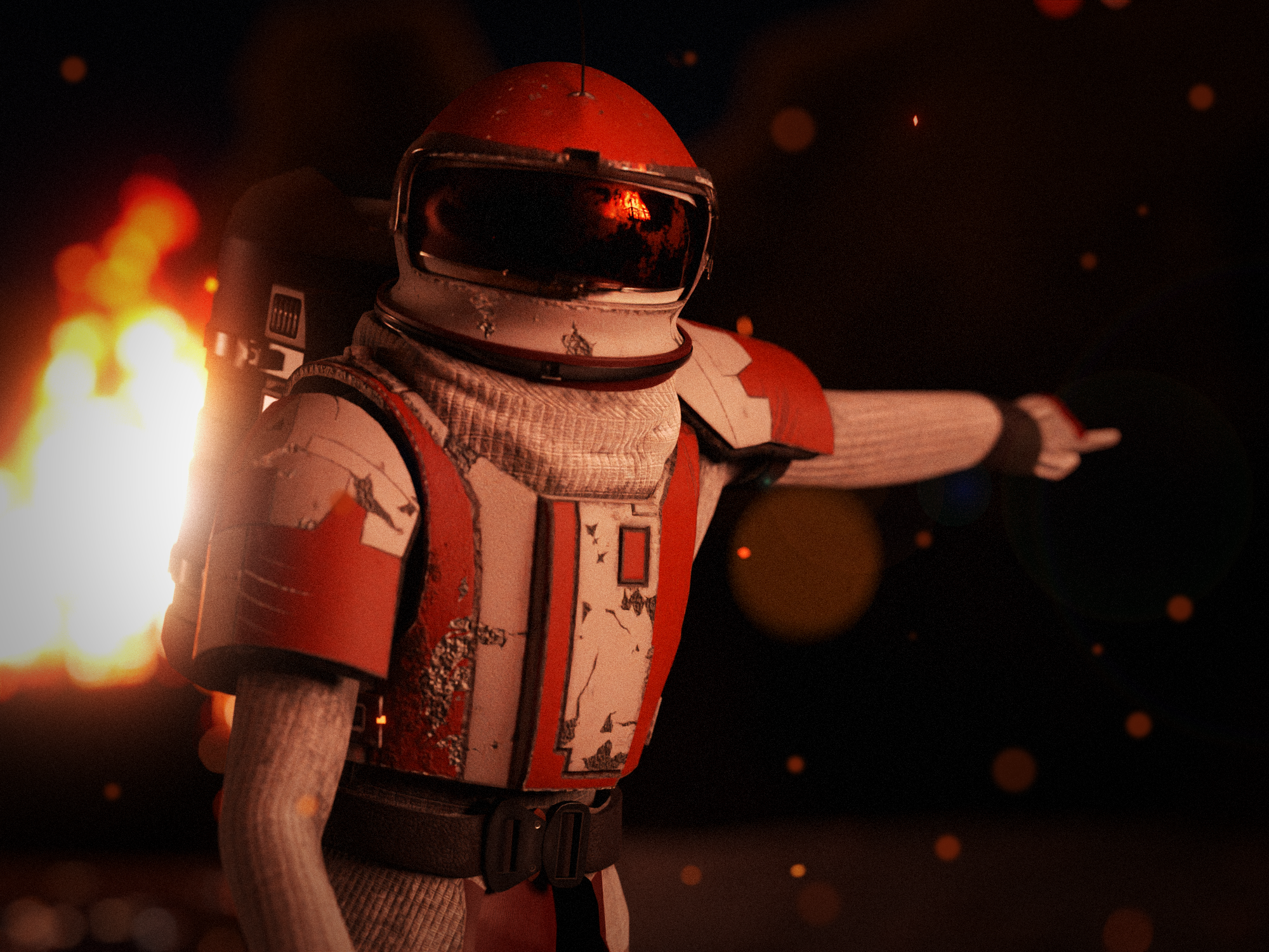The avatar is part of a larger narrative piece that I’ve been working on for a long time. In it, characters are exploring and discovering a new planet, but there’s a darker underside to it. There’s always something under the surface. EXO-1 is one of the suits in my world used for exploration. The suit is rugged, worn down, and battle-hardened, reflecting a whimsical space travel theme with a super dark undertone. I wanted to incorporate cool elements of retro-futurism. The suit is kind of like a 1950s version of a sci-fi future. It’s a standard issue suit that I imagine a company in my world having.