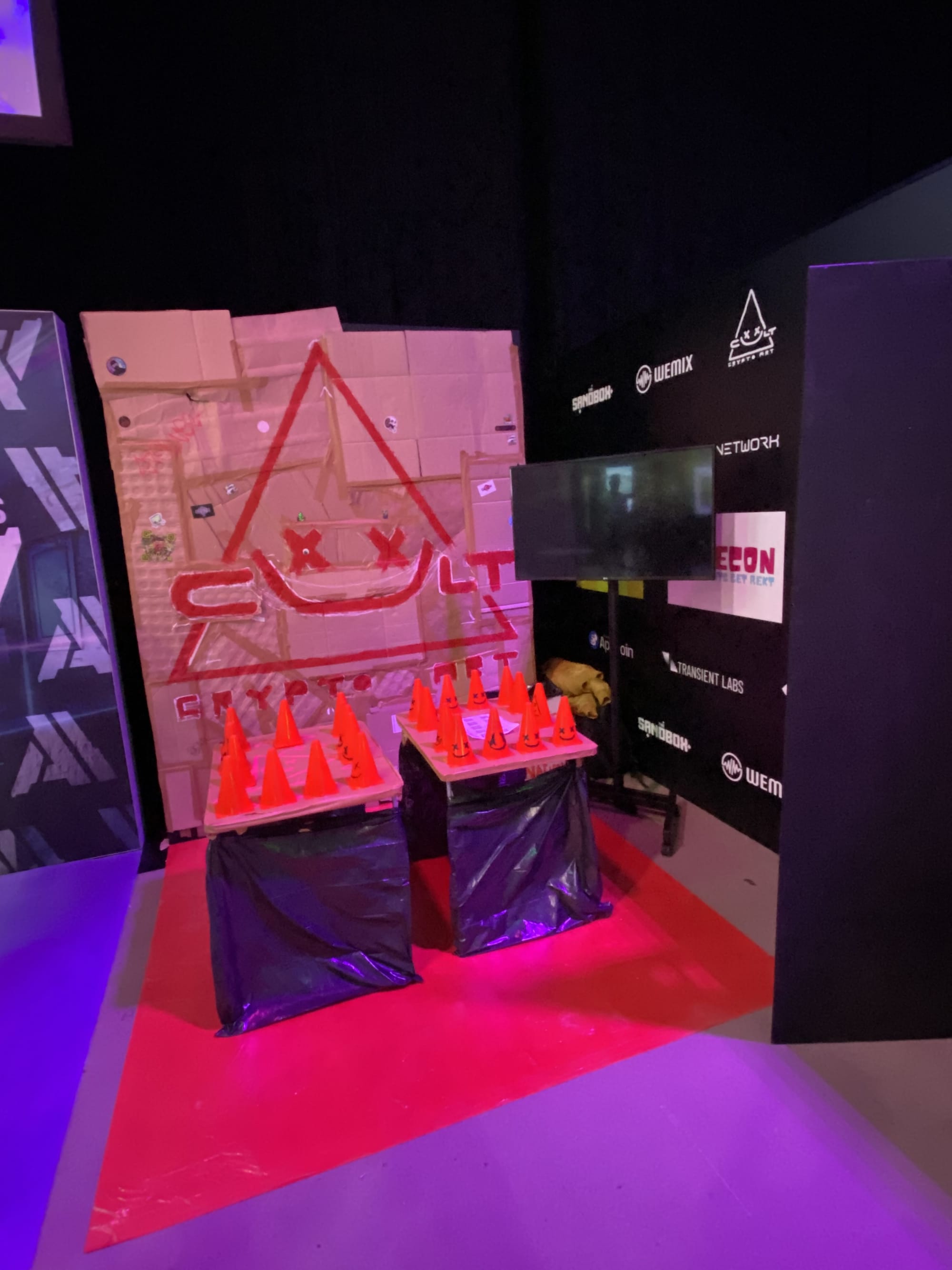 “Cult of Cryptoart is an art collective based on independence and mutualization, based on our founder AlottaMoney’s idea of sharing and collaboration. We are really happy to have put this booth together to bring people around what is important for us which is art. We gathered cardboard in the street in order to create the ephemeral booth where everybody during the event will keep customize. Our goal is to display augmented reality art through red physical cones equipped with tags that will redirect on MONA augmented reality viewer.” - Ogar & team