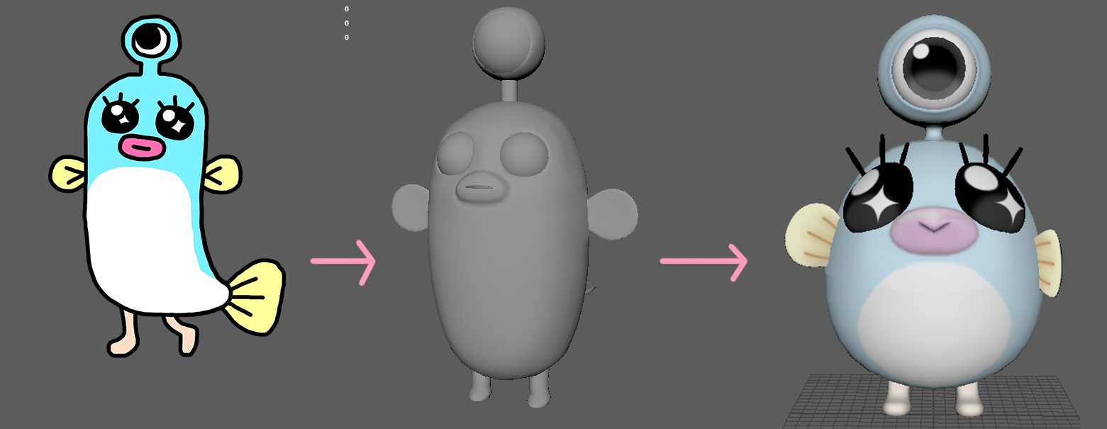 Unagi Poke: "I like that she is simple, cute and chubby. Pepen and Unagi are originally created to be a Vtuber and virtual cosplayer, so I designed the character to look good in any costume."